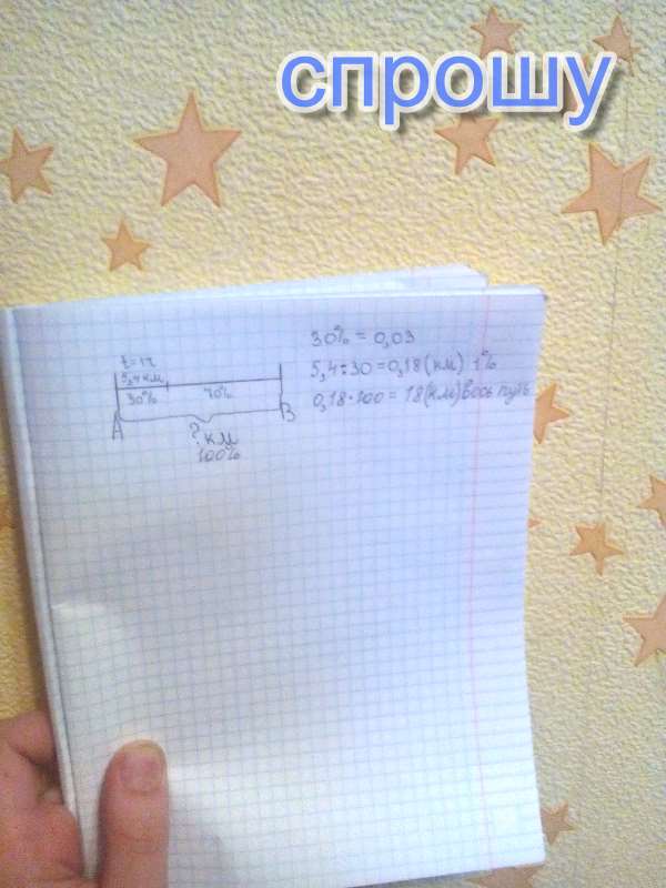 Пешеход вышел из пункта А в пункт В за час он прошёл 5,4км. Пешеходу осталось пройти 70% маршрута Какое расстояние между пунктом А и пунктом В. СРОЧНО!!!!!