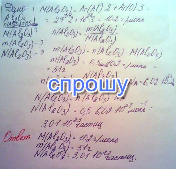 Оксид алюминия имеет формулу Al2O3. Вычислить: молярную массу вещества , массу 0,5 моль, число частиц в 0,5 моль. С дано и решением, помогите пожалуйста!!!!!!!!!!!!
