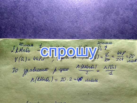 Вычислите количество вещества перманганата калия, из которого получен кислород объемом 448 л(н.у)