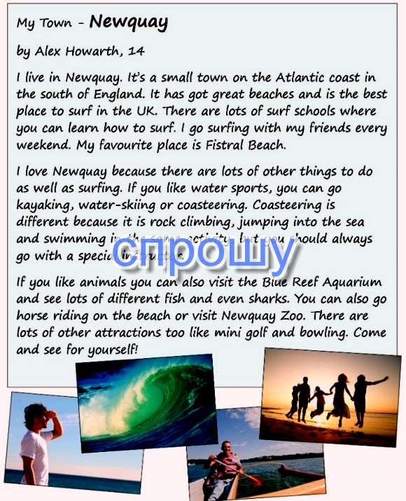 Ньюквай Алекс Хоуартом, 14. Я живу в Ньюквей. Это небольшой городок на побережье Атлантического океана на юге Англии. Она имеет прекрасные пляжи и лучшее место для серфинга в Великобритании. Есть много школ серфинга, где вы можете узнать, как прибой. заняться серфингом с друзьями каждые выходные. Мое любимое место Фистрал Бич. Я люблю Newguay, потому что есть много других вещей, чтобы сделать, а также серфинг. Если вы любите водные виды спорта, вы можете пойти на байдарках, водные лыжи или Coasteering. Coasteering отличается, потому что это скалолазание, прыжки в море и плавание в той же деятельности, но вы всегда должны идти со специальным инструктором. Если вы любите животных, вы можете также посетить Голубой риф аквариум и увидеть много разных рыб и даже акул. Вы также можете покататься на лошадях на пляже или посетить зоопарк. Есть много других достопримечательностей тоже, как мини-гольф и боулинг. Приходите и убедитесь в этом сами!