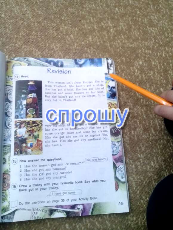 Эта девочка в супермаркете.Это очень большой магазин.У нее есть тележка.Что у нее в тележкеВ тележке несколько пачек апельсинового сока и мороженого.Есть ли у нее морковь или яблокиДа, у нее есть.Есть ли у нее сардиныНет, их нет.