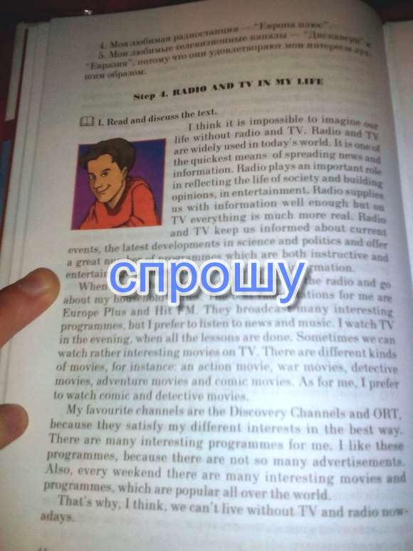 Когда я прихожу со школы, я включаю радио и занимаюсь своими повседневными обязанностями. Для меня лучшие радиостанции - Европа плюс но я предпочитаю слушать музыку и новости. Я смотрю телевизор по вечерам, когда все уроки уже сделаны. Иногда мы можем посмотреть довольно интересный фильм по ТВ. Существуют различные категории фильмов, такие как : акшн , военные, детективы, приключенческие и комедии.