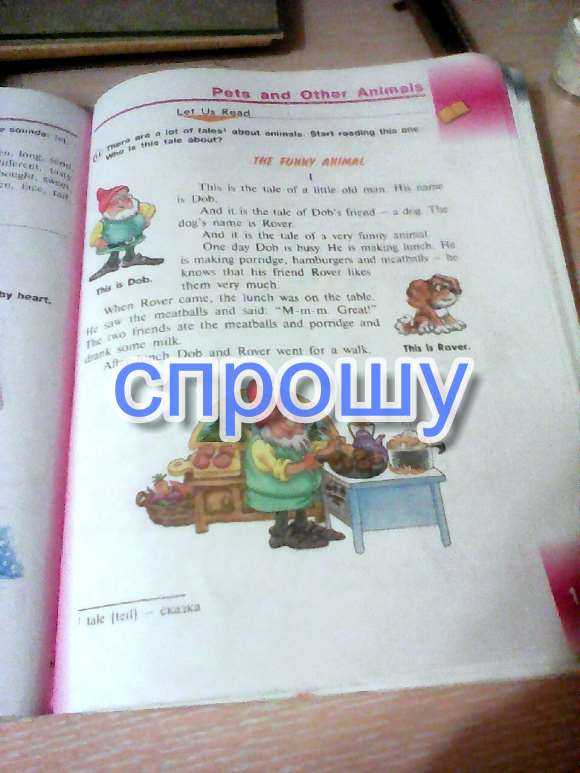 Это рассказ о старичке. Его зовут Доб. И этот рассказ о его друге собаке. Его имя Ровер. И этот рассказ про очень смешное животное. Однажды Доб был занят. Он делает ланч. Он делает овсяную кашу, гамбургеры и тефтели - он знает, что его друг Ровер любит их очень хорошо. Когда Ровер пришёл, то ланч был на столе. Он увидел фрикадельки и сказал: "М-м-м-отлично!". Два друга съели фрикадельки, кашу и попили молоко. После ланча Доб и Ровер пошли гулять.