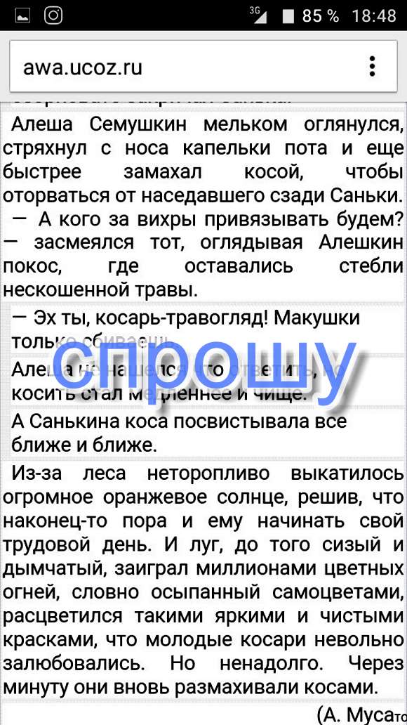 Из-за леса неторопливо выкатилось огромное оранжевое солнце, решив, что наконец-то пора и ему начинать свой трудовой день. И луг, до того сизый и дымчатый, заиграл миллионами цветных огней, словно осыпанный самоцветами, расцветился такими яркими и чистыми красками, что молодые косари невольно залюбовались. Но ненадолго. Через минуту они вновь размахивали косами.