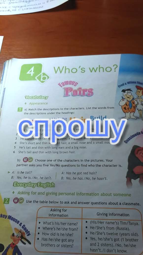 Нужно соотнисти предложения к картинкам: Например: 5 он высокий и худой с длинными ушами и большим носом-гууфи.