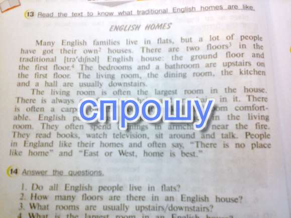 Многие английские семьи живут в квартирах но у многих есть и свои личные дома. В традиционном английском стиле в этих домах есть два этажа: первые этаж ( он как бы на земле находится ) и второй этаж ( но называется как первый....вАнглии все по странному) . Спальная комната и ванная находятся вверх по ступенькам на втором этаже . Гостиная, столовая и кухня обычно находятся на первом этаже