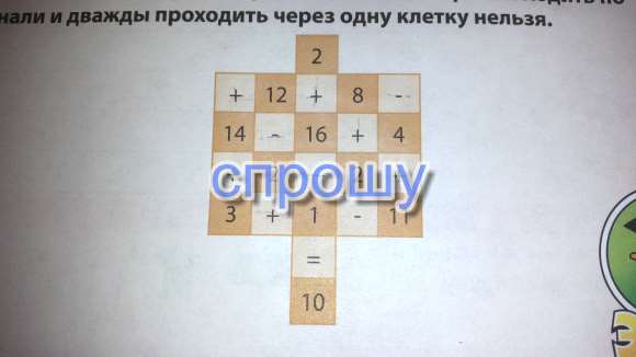 Найди и нарисуй верный путь от верхней клеткис цифрой 2 до нижней клетки с числом 10 так,чтобы равенство было верным.Ходить по диоганали и дважды проходить через одну клетку нельзя.