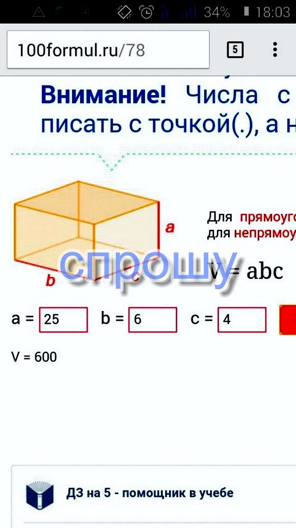 Найти объём прямоугольго параллелепипеда с измерениями 25м,6м,4м