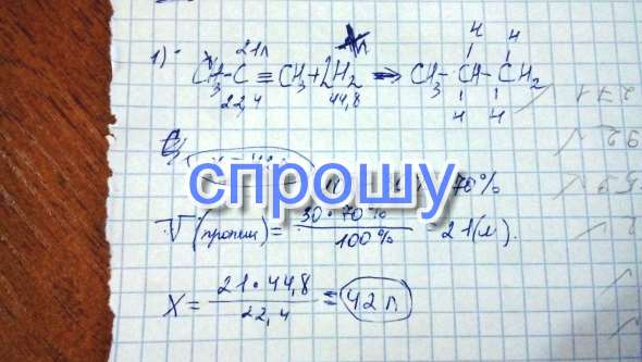 Найдите объем водорода (н.у.), необходимый для полного гидрирования 30л пропина, содержащего 30% примесей.