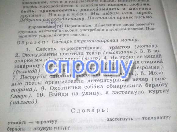 Слесарь отремонтировал мотор. Экскурсанты посетили выставку. В зоопарке мы видели тигра. На уроке не мешай соседу. Долгий разговор утомил больного. Ася получила телеграмму. Лесорубы спилили высокую сосну. Молодые поэты организовали литературную викторину. Охотничья собака обнаружила зверя. Выйдя на улицу, я застегнул пальто.