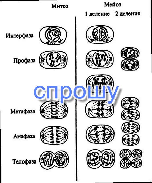 Мейоз и его фазы Мейоз — это деление в зоне созревания половых клеток, сопровождающееся уменьшением числа хромосом вдвое. Он состоит из двух последовательно идущих делений, имеющих те же фазы, что и митоз. Однако, как показано в таблице «Сравнение митоза и мейоза», продолжительность отдельных фаз и происходящие в них процессы значительно отличаются от процессов, происходящих при митозе. Эти отличия в основном состоят в следующем. В мейозе профаза I более продолжительна. В ней происходит конъюгация (соединение гомологичных хромосом) и обмен генетической информацией. В анафазе I центромеры, скрепляющие хроматиды, не делятся, а к полюсам отходит одна из гомологмейоза митоза и ичных хромосом. Интерфаза перед вторым делением очень короткая, в ней ДНК не синтезируется. Клетки (галиты), образующиеся в результате двух мейотических делений, содержат гаплоидный (одинарный) набор хромосом. Диплоидность восстанавливается при слиянии двух клеток — материнской и отцовской. Оплодотворенную яйцеклетку называют зиготой. Митоз и его фазы Митоз, или непрямое деление, наиболее широко распространен в природе. Митоз лежит в основе деления всех неполовых клеток (эпителиальных, мышечных, нервных, костных и др.). Митоз состоит из четырех последовательных фаз (см. далее таблицу). Благодаря митозу обеспечивается равномерное распределение генетической информации родительской клетки между дочерними. Период жизни клетки между двумя митозами называют интерфазой. Она в десятки раз продолжительнее митоза. В ней совершается ряд очень важных процессов, предшествующих делению клетки: синтезируются молекулы АТФ и белков, удваивается каждая хромосома, образуя две сестринские хроматиды, скрепленные общей центромерой, увеличивается число основных органоидов цитоплазмы. В профазе спиралируются и вследствие этого утолщаются хромосомы, состоящие из двух сестринских хроматид, удерживаемых вместе центромерой. К концу профазы ядерная мембрана и ядрышки исчезают и хромосомы рассредоточиваются по всей клетке, центриоли отходят к полюсам и образуют веретено деления. В метафазе происходит дальнейшая спирализация хромосом. В эту фазу они наиболее хорошо видны. Их центромеры располагаются по экватору. К ним прикрепляются нити веретена деления. В анафазе центромеры делятся, сестринские хроматиды отделяются друг от друга и за счет сокращения нитей веретена отходят к противоположным полюсам клетки. В телофазе цитоплазма делится, хромосомы раскручиваются, вновь образуются ядрышки и ядерные мембраны. В животных клетках цитоплазма перешнуровывается, в растительных — в центре материнской клетки образуется перегородка. Так из одной исходной клетки (материнской) образуются две новые дочерние.