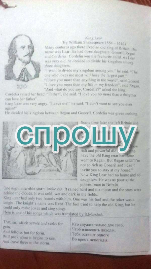 Много веков назад жил старый король Британии. Его звали Лир. Были у него три дочери Гонерил, Реган и Корделия. Корделия была его любимым ребёнком. Лир был очень стар, он решил разделить его Королевство между тремя дочерьми.