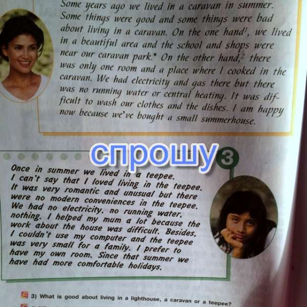 несколько лет назад мы жили в фургоне летом. некоторые вещи были хорошие, а некоторые вещи были плохие в жизни в фургоне. с одной стороны, мы жили на красивом участке и школа, и магазины были рядом с парковкой нашего фургона. с другой стороны, в фургоне была только одна комната и место, где я готовила .у нас было электричество и газ, но там не было проточной воды или центрального отопления .это было трудно стрирать нашу одежду или мыть посуду. я счастлива сейчас, потому что мы купили маленькую дачу