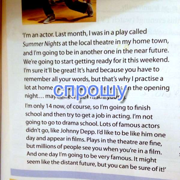 "Я актер. В прошлом месяце я был на пьесе под названием Summer Nights(Летние Ночи) в местном театре моего родного города, и я собираюсь быть в другом в ближайшем будущем. Мы собираемся начать готовиться к нему в эти выходные. Я уверен, что это будет здорово! Это трудно, потому что вы должны помнить все ваши слова, но именно поэтому я занимаюсь много у себя дома. Я всегда получаюсь очень нервным в начале ночи ... может быть, потому, что я еще молод. Мне сейчас только 14, разумеется , таким образом я собираюсь закончить школу, а затем попытаться получить работу в действии. Я не собираюсь идти в школу драмы. Много известных актеров не ходили, такие как Джонни Депп. Я бы хотел быть похожим на него в один прекрасный день и появиться в фильмах. Играет в театре это превосходно, но миллионы людей видят вас, когда вы находитесь в фильме. И в один прекрасный день я собираюсь быть очень известным. Казалось бы, как в отдаленном будущем, но вы можете быть уверены в этом! "