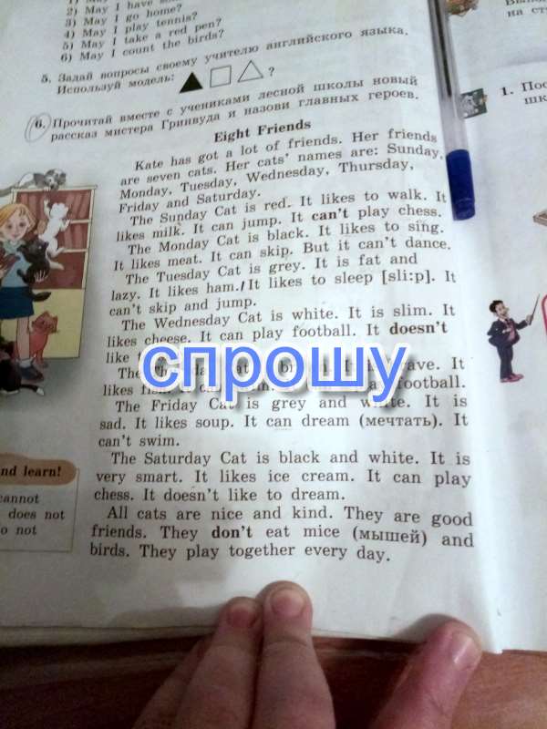 У Кейт много друзей. Её друзья 7 кошек. Их зовут Воскресенье, Понедельник и т.д. до Субботы.