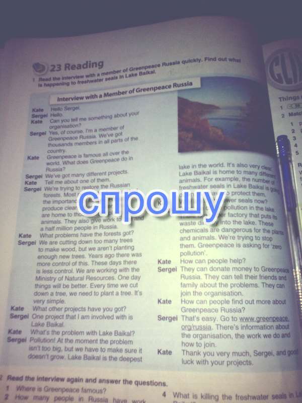 Сергей. Из-за загрязнения озера. Прямо в озеро попадают отходы бумажной фабрики. Эти химические вещества опасны для растений и животных. Мы пытаемся прекратить это. Гринпис требует «нулевого загрязнения».