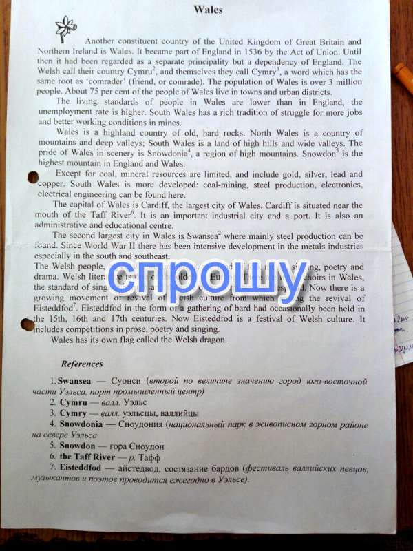 Другой составляющей страны (ложь! Соединенное Королевство Великобритании и Северной Ирландии Уэльс вошел в состав Англии в 1536 году акта об унии, а до тех пор это было рассматривать как отдельное княжество, но ла Аль-зависимость от Англии. Валлийцы называют свою страну тИЦ н и сами они называют Cymryy ла-слово, которое имеет тот же корень, товарищ (друга или товарища), население Уэльса составляет более 3 миллионов человек. Около 75 процентов людей в Уэльсе проживает в городах и городских округов, уровень жизни людей! в Уэльсе ниже, чем в Англии, уровень безработицы выше Южного Уэльса ла богатыми традициями борьбы за дополнительных рабочих мест и улучшения условий труда в шахтах Уэльса хайленд стране я старый, твердых пород. Северный Уэльс-это страна гор и глубоких долин Южного Уэльса #земля высоких холмов и широких долин, гордость Уэльса в продавец Сноудония региона или высокие горы Сноудон* это самая высокая гора в Англии и Уэльсе, за исключением угля, минеральных ресурсов ограничены, и включают в себя золото, серебро, свинец и медь, Южный Уэльс более развиты: добыча угля. производство стали, электроники, электротехники можно найти здесь! Столица Уэльса (Кардифф, крупнейший город (Уэльса. Карты расположен возле устья реки Тафф это важный промышленный город! и порт. Это также административный и образовательный центр. Второй по величине город Уэльса в Суонси Где в основном производства стали может быть после Второй Мировой Войны Е! т! ** была #л (уровень (нефтяники! в металлургической промышленности, особенно на юге и юго-востоке Уэльса людей, особенно в сельской местности, любят народную музыку, пение, поэзия и драма. Валлийская литература является одним из старейших в веревку, есть много хоров в Уэльсе, уровень пение и любовь к хорошей #музыки широко распространена. Сейчас ширится движение возрождения культуры Уэльса, из которой выскочили возрождение Fisteddfod фестивале в виде сбора бард периодически проводятся в (ш, 16 и 17 веков, теперь числится (TOD-это фестиваль культуры Уэльса. Она включает в себя соревнования в прозе, поэзии и пения Уэльс имеет свой собственный флаг назвал Валлийского дракона,