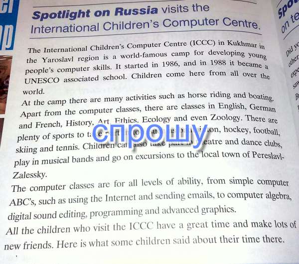Международный детский (ICCC) в Кухмар Ярославская область является всемирно известный лагерь для развития вами навыков работы с компьютером. Это началось в 1986 году, а в 1988 году она стала Ассоциированная школа ЮНЕСКО. Дети презжают сюда со всего мира. Катание на лошадях. В лагере есть много мероприятий, помимо компьютерных классов, есть классы английского,немецкого и французского языка,истории, искусства, этики, экологии и даже зоологии. Есть много видов спорта принять участие в которых тоже можно. Такие как бадминтон, хоккей, лыжи и теннис. Дети также могут принять участие в театральной,танцевальной игре, в музыкальных коллективах отправиться на экскурсии в местное среднедушевое небо. Компьютерные классы для всех уровней способности, от АВС, таких как использование Интернета и отправки электронной почты, компьютерная алгебра редактирования цифрового звука, программирование и улучшенние графики. Все дети, которые посещают ICCC имеют возможность завести новых друзей. Вот что еще хочу сказать:некоторые дети не жалеют о своем времени там.