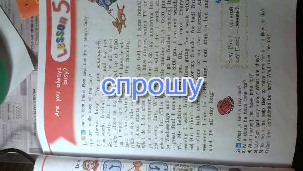 Я всегда занят! У меня есть школьные занятия, домашние задания, футбольная практика и моя собака, Джуди. Но у меня есть время для всех этих вещей. Вот мой день: я встаю в 7:00 быстро. Я не смотрю телевизор утром.