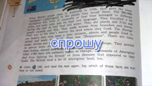 Когда в 1788 году британцы приплыли в Австралию, он назвали людей, которых там нашли (обнаружили), аборигенами. 300000 аборигенов, живших в Австралии в то время, принадлежали к различным племенам, и у каждого племени были свой язык и своя земля (территория). В течение года они много путешествовали в поисках пищи и воды. Они питались растениями и фруктами, а также ловили зверей и рыбу. Они строили дома из веток и листьев. Их образ жизни не разрушал землю, на которой они жили. Аборигены верят, что давным-давно растения, животные и люди жили вместе и составляли мир. Это было "время мечты". Существует множество песен, рассказов и картин о нем.