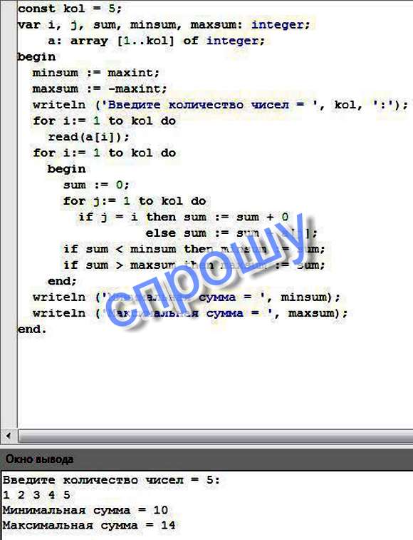 1. сделал программу на изменяющееся количество чисел (const kol = 5), меняя это число можно изменить количество вводимых чисел, а так же обрабатываемых (например если вместо 5 сделать 8, то программа будет рассматривать 8 чисел и из них суммировать 7)