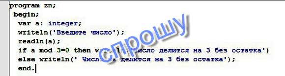 program zn; begin; var a: integer; writeln(Введите число); readln(a); if a mod 3=0 then writeln(Число делится на 3 без остатка) else writeln( Число не делится на 3 без остатка); end.