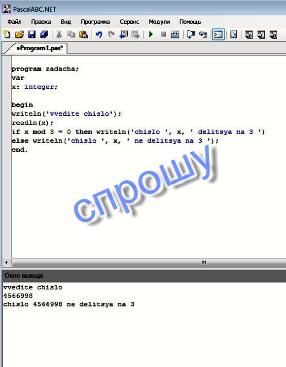 beginwriteln(vvedite chislo);readln(x);if x mod 3 = 0 then writeln(chislo , x, delitsya na 3 ) else writeln(chislo , x, ne delitsya na 3 );end.