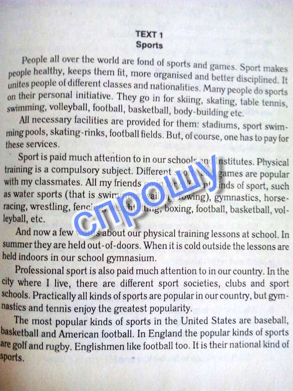 Спортивные люди во всем мире любят спортивные состязания и игры. Спорт делает людей здоровыми, держит их нужными, более организованными и дисциплинированными. объединяет людей разных классов и национальностей. Многие люди занимаются спортом на их личный Они идут на лыжах, коньках, теннис, плавание, настольный волейбол, баскетбол , бодибилдинг и т.д. Все необходимые средства предусмотрены для них: стадионы, спортивные плавательные бассейны , катках,футбольные поля. Но, конечно же, приходится платить за эти услуги. Спорту уделяется большое внимание в нашей школе и институтах. Физическая подготовка является обязательным предметом.Различные виды спорта и игры пользуются популярностью у моих одноклассников. Все мои друзья занимаются разными видами спорта, такие как водные виды спорта (что плавание, парусный спорт, гребля), гимнастика, конные скачки, борьба, фехтование, тяжелая атлетика, бокс, баскетбол, футбол, волейбол и т.д. И теперь несколько слов о наших уроках физической культуры в школе. Летом они проводятся вне дверей. Когда на улице холодно, уроки проводятся в закрытом помещении в нашем школьном спортзале. Профессиональному спорту также уделяется большое внимание в нашей стране. В городе, где я живу, есть различные спортивные общества, клубы и спортивные школы. Практически все виды спорта популярные в нашей стране, но тренажерный зал гимнастики и теннис пользуются наибольшей популярностью. Самые популярные виды спорта в Соединенных Штатах бейсбол ,баскетбол и американский футбол. В Англии популярные виды спорта в гольф и регби, англичане любят футбол это тоже их национальный вид спорта.