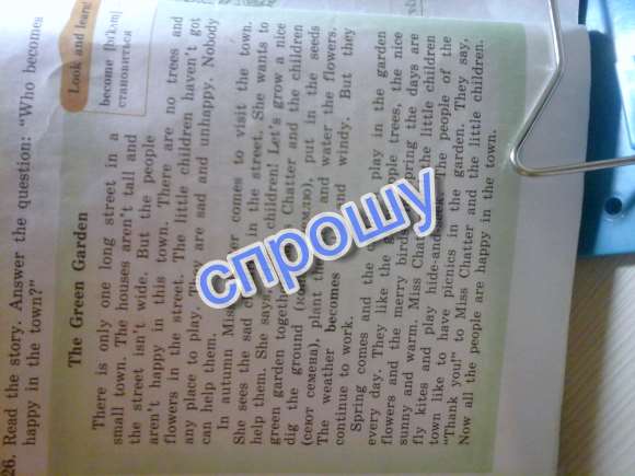 В этом маленьком городке только одна длинная улица. Дома не высоки и улицы не широкие. Но люди несчастливы в этом городе. Там нет деревьев и цветов на улице. У маленьких детей нет никаких мест для игр. Там грустно и несчастливо. Никто не может помочь им. Осенью Мисс Чэттер посещает этот город. Она видит грустных детей на улице. Она хочет помочь им. Она говорит, "Дорогие дети! Давайте посадим красивый зеленый сад вместе!" Мисс Чэттер и дети копают землю, сеют семена, садят деревья и поливают цветы. Погода становится холодной и ветреной. Но они продолжают работать. Весна наступила и дети играют в саду каждый день. Им нравится зеленые яблони, красивые цветы и радостные птицы. Весной дни солнечные и теплые. Мисс Чэттер и маленькие дети запускают воздушных змеев и играют в прятки. Люди в городе любят пикники в саду. Они говорят, "Спасибо!" Мисс Чэттер и маленьким детям. Сейчас все люди в городе счастливы