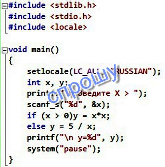 void main(){ setlocale(LC_ALL, "RUSSIAN"); int x, y; printf("\n Введите X gt; "); scanf_s("d", amp;x); if (x gt; 0)y = x*x; else y = 5 / x; printf("\n y=d", y); system("pause");}
