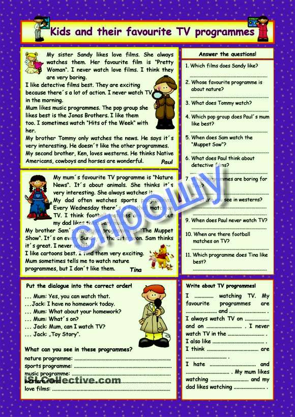 1)Sandy likes love films. 2) Pauls mother prefers music programmes . 3) Tommy only watches the news. 4)Pauls mum likes best The Jonas Brothers. 5) Sam watches The Muppet Show every Sunday in the afternoon.6) Paul thinks the detective films are very exciting.7) Tina thinks the football matches are boring. 8) In westerns we can see wonderful stories about cowboys, Native Americans and horses.9) Paul never watches TV in the mornings 10) Every Wednesday there are football matches on TV. 11) Tinas favourite programme is Nature News.