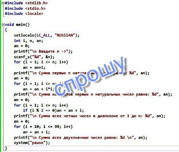 void main(){ setlocale(LC_ALL, "RUSSIAN"); int i, n, an; an = 0; printf("\n Введите n -gt;"); scanf_s("d", amp;n); for (i = 1; i lt;= n; i++) an = an+i; printf("\n Сумма первых n натуральных чисел равна: d", an); an = 0; for (i = 1; i lt;= n; i++) an = an + i*i; printf("\n Сумма квадратов первых n натуральных чисел равна: d", an); an = 0; for (i = 1; i lt;= n; i++) if (i 2 == 0)an = an + i; printf("\n Сумма всех четных чисел в диапозоне от 1 до n: d", an); an = 0; for (i = 10; i lt;= 99; i++) an = an + i; printf("\n Сумма всех двухзначных чисел равна: d \n", an); system("pause");}