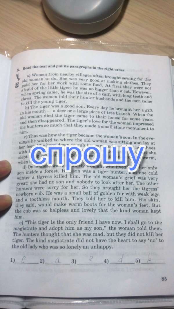 d) Жила-была однажды пожилая женщина, которая жила со своим единственным сыном в лесу. Её сын был охотником на тигров и однажды, одной холодной зимой, тигрица убила его. Горе пожилой женщины было очень велико; у неё теперь не было ни сына ни кого бы то ни было ещё, чтобы присмотреть за ней. Остальные охотники сочувствовали ей. Поэтому, они принесли ей одного из новорождённых детёнышей тигрицы. Они сказали ей убить его. Из его кожи, сказали они, можно сделать тёплые ботинки для женских ног. Но детёныш был таким беспомощным и милым, что добрая женщина решила сохранить ему жизнь.