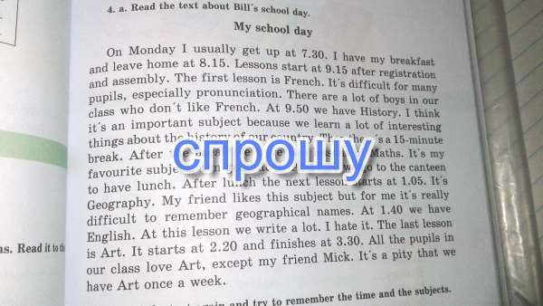 в понедельник я обычно встаю в 7.30. У меня есть tny завтрак и уйти из дома в 8.15. Уроки начинаются в 9.15 после registratiou и сборки. Первый урок Ia французский. трудным для многих upils, особенно произношение. Есть много мальчиков в нашем, которые не любят французов. В 9.50 мы, я это важная тема, потому что мы узнаем много интересного об истории нашей страны. Тогда есть п 15 минут После перерыва у нас есть два урока математики, ее моей любимой теме. Я хорош в этом. В 11.50 мы идем в столовую обедать. После обеда на следующий урок начинается в географии. Мой друг любит эту тему, но для меня это очень трудно вспомнить географические названия. В 1.40 у нас есть английский. На этом уроке мы пишем много. Я ненавижу это. Последний урок ст. Она начинается в 2.20 и заканчивается в 3.30. Все ученики в нашем классе любят искусство, кроме моего друга Мика. Жаль, что мы Арт один раз в неделю.