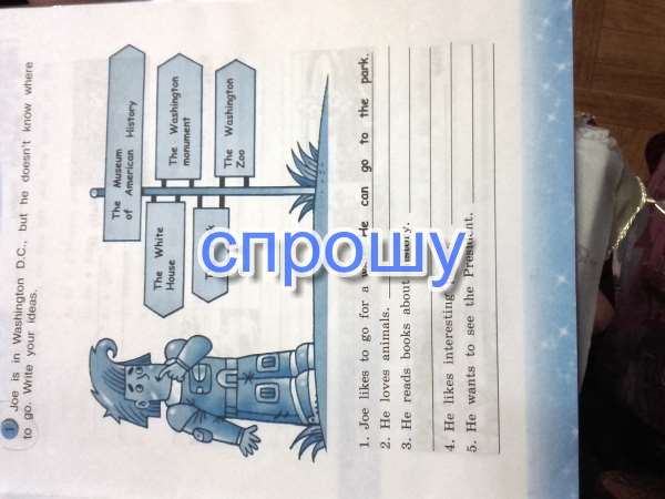 Помогите с английским пожалуйста!!!!Joe is in Washington T.C., but he doesn't know where to go.Write your ideas.