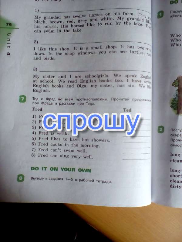 Фред не худой,старый,любит принемать горячую ванну,гатовит по утрам,не умеет хорошо плавать,умеет хорошо петь.Аналогично делаешь антониумы только на англиском.(3,4,прости незнаю)