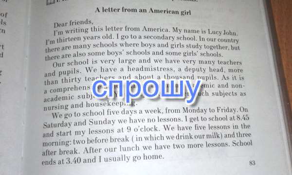 Моё имя Люси Джон. Мне 13 и я ходу в среднюю школу. В нашей стране очень много школ, где девочки и мальчики учатся вместе, но так же есть школы только для мальчиков и только для девочек. Наша школа очень большая, у нас много учеников и учителей. У нас есть Директор, Завуч, 30 учителей и около 1000 учеников. У нас есть академические предметы и не академические, вы можете выбрать. У нас даже есть такие предметы, как "врачевание" и "хранение домашнего очага"