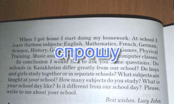 Когда я прихожу домой, я начинаю делать домашнее задания. В школе я изучаю 13 предметов: английский, математику, французский, немецкий, естествоведение (у них в этом предмете микс химии и физики нашей), историю, географию, рукоделие, изобразительное искусство, игры, физкультуру, музыку, религоведение (говоря нашим языком) и информатику (а не компьютерные классы, как дословно). В заключение, я отела бы задать тебе несколько вопросов. Сильно ли отличаются школы в Казахстане от нашей школы Учатся ли мальчики девочки вместе или в раздельных школах Каким предметам тебя учат в школе Сколько предметов ты изучаешь Каков твой школьный день Он отличается от нашего школьного дня (тут речь про распорядок). Пожалуйста, напиши мне о твоей школе,