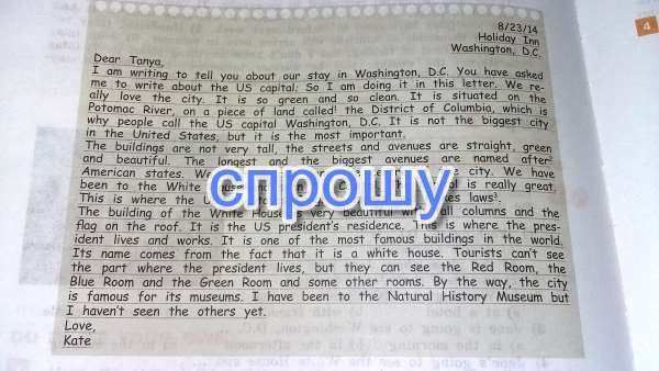 я пишу, чтобы рассказать тебе о нашем пребывании в Вашингтоне, Ты просила меня написать о столице Соединенных Штатов. Поэтому я делаю это в этом письме (рассказываю то есть). Нам правда очень понравится город. Она такой зеленей и такой чистый. Он расположен на реке Потомак, на территории, которая называется Округом Коламбия, и поэтому люди называют столицу Соединенных штатов Вашингтон, Д.С. (Дистрикт Комламбия) Это не самый большой город в США, зто самый важный.