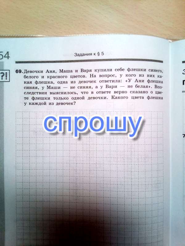 Девочки Аня, Маша и Варя купили себе флешки синего, белого и красного цветов. На вопрос, у кого из них какая флешка, одна из девочек ответила: "У Ани флешка синяя, у Маши- не синяя, а у Вари- не белая." Впоследствии выяснилось, что в ответе верно сказано о цвете флешки только одной девочки. Какого цвета флешка у каждой из девочек?