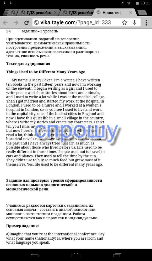 Меня зовут Мэри Бейкер. Я писательница. Я написала десять книг за последние 15 лет и сейчас работаю над одиннадцатой. Я начала писать ещё маленькой девочкой и писала поэмы и короткие истории о птицах и животных, также я много писала, когда была медицинском колледже. Затем я вышла замуж и начала работать в больнице в Лондоне. Я была медсестрой и работала в женском госпитале в Лондоне, поэтому как видите я жила и работала в столице, одной из самых занятых городов Англии и сейчас я живу спокойной жизнью в маленькой деревушке, где я пишу свои истории и создаю персонажей. Не могу сказать, что я скучаю по городской жизни. Раньше это было мне интересно, но сейчас я предпочитаю тишину, где я могу много читать, думать и писать исторические книги. Сейчас я пишу исторические новеллы. Мне всегда было интересно прошлое и я всегда пыталась выучить как можно больше о тех людях, которые жили до нас. Жизнь была совсем другой в те времена. Люди не путешествовали на машинах или самолётах. Они определяли время по солнцу. Они не покупали еду, а в основном выращивали её сами. Да, жизнь была совсем другой много лет назад.