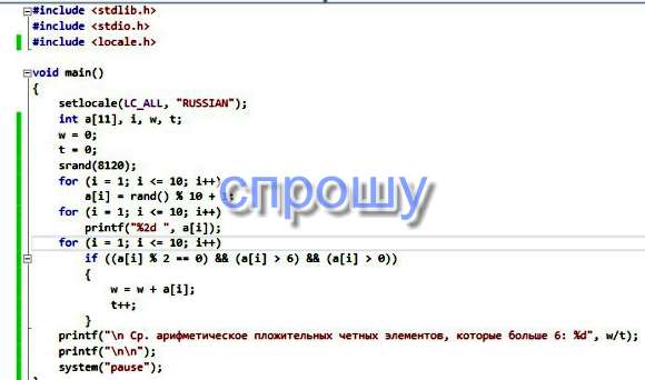 void main(){ setlocale(LC_ALL, "RUSSIAN"); int a[11], i, w, t; w = 0; t = 0; srand(8120); for (i = 1; i lt;= 10; i++) a[i] = rand() 10 + 1; for (i = 1; i lt;= 10; i++) printf("2d ", a[i]); for (i = 1; i lt;= 10; i++) if ((a[i] 2 == 0) amp;amp; (a[i] gt; 6) amp;amp; (a[i] gt; 0)) { w = w + a[i]; t++; } printf("\n Ср. арифметическое пложительных четных элементов, которые больше 6: d", w/t); printf("\n\n"); system("pause");}