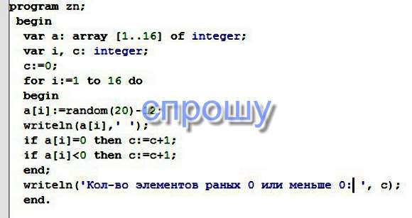 program zn; begin var a: array [1..16] of integer; var i, c: integer; c:=0; for i:=1 to 16 do begin a[i]:=random(20)-12; writeln(a[i], ); if a[i]=0 then c:=c+1; if a[i]lt;0 then c:=c+1; end; writeln(Кол-во элементов раных 0 или меньше 0: , c); end.