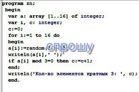 program zn; begin var a: array [1..16] of integer; var i, c: integer; c:=0; for i:=1 to 16 do begin a[i]:=random(20)-12; writeln(a[i], ); if a[i] mod 3=0 then c:=c+1; end; writeln(Кол-во элементов кратных 3: , c); end.