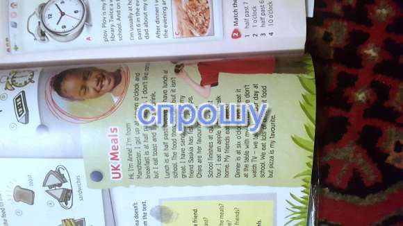 Привет, я Анна! Я из Манчестера. Я встаю в семь часов и завтракаю в половине восьмого я не люблю это, но я ем тост и у меня есть напиток. Обед в половине первого. У меня есть ланч в школе. Пища у меня хорошая , но это не так много, у меня есть бутерброды, но моя подруга Саския имеет рыбу и чипсы. Чипсы ее любимая еда! Школа заканчивается в четверть пятого, я ем яблоко, когда я иду домой. Мои друзья едят сладости! Ужин в шесть часов, и я ем его за столом с моей семьей. Мы не смотрим телевизор, мы говорим о нашем дне в школе. Мы едим много разной пищи, но пицца моя любимая.
