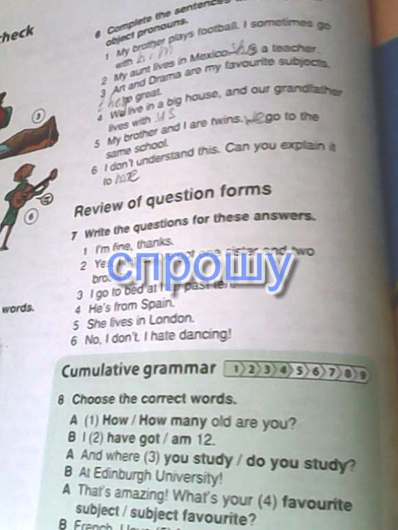 7) Write the questions for these answers. 1. I'm fine, thanks. 2.Yes, I have. I've got one
