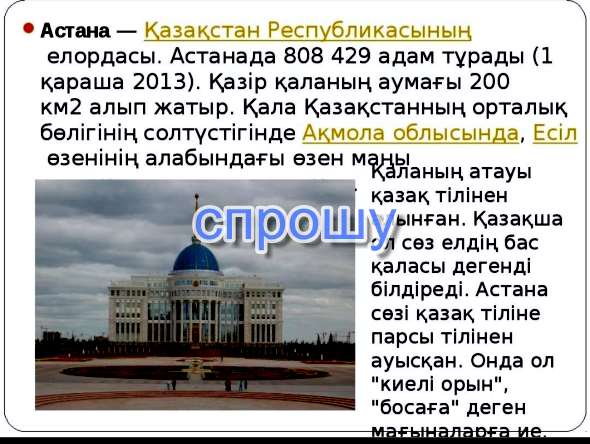 Астана - столица Казахстана. В Астане живут около 808929 человек.