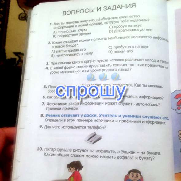 1)В.2)С.3) При помощи нервной системы.4)На уроке математики в количестве 3 , а на родном языке трех.5)При помощи звонка по телефону. 6)Информационный источник.( или прочто источник ).7)Благодаря машине мы можем передвигаться узнавать новые места тем самым получать новую информацию.8)Ученик отвечающий у доски дает информацию а те кто слушают ее получают , тоесть ученик у доски источник, а другие приемники.(шутка:ученик ничего незнает а ему подсказывают поэтому все наоборот ха ха ха) 9)Для передачи и приема информации.10)Асфальт и бумага это источник информации(вообще холст должно быть , но у тебя задания по информатике).