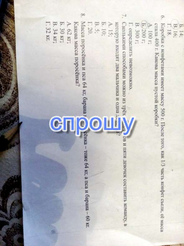 8. B, исходя из того, что масса пса и барана на 4 кг меньше, чем масса барана и парасенка, можно понять, что парасенок весит на 4кг больше, чем пёс, следовательно, подходит ответ "В", то есть 34, т.к 64= 34+30
