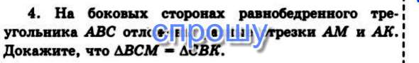 треуг ВСМ=треугСВК т. к. ВС - общая, угол С=углу В т. к. Треуг АВС равнобедренны
